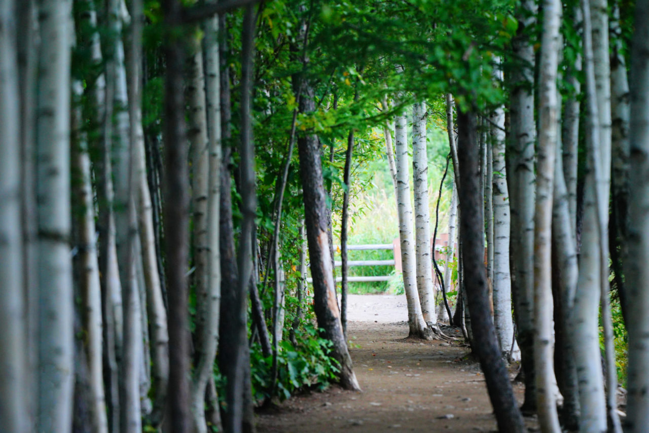 翌日の朝は曇り空、あいにく空は焼けませんでしたが、北海道らしい白樺並木の遊歩道です。
