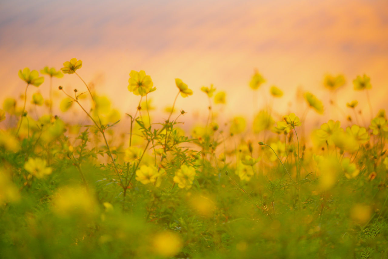 コスモスじゃなくて、なんだろう黄色の花、オレンジ色に染まっているのはビニールハウスです。