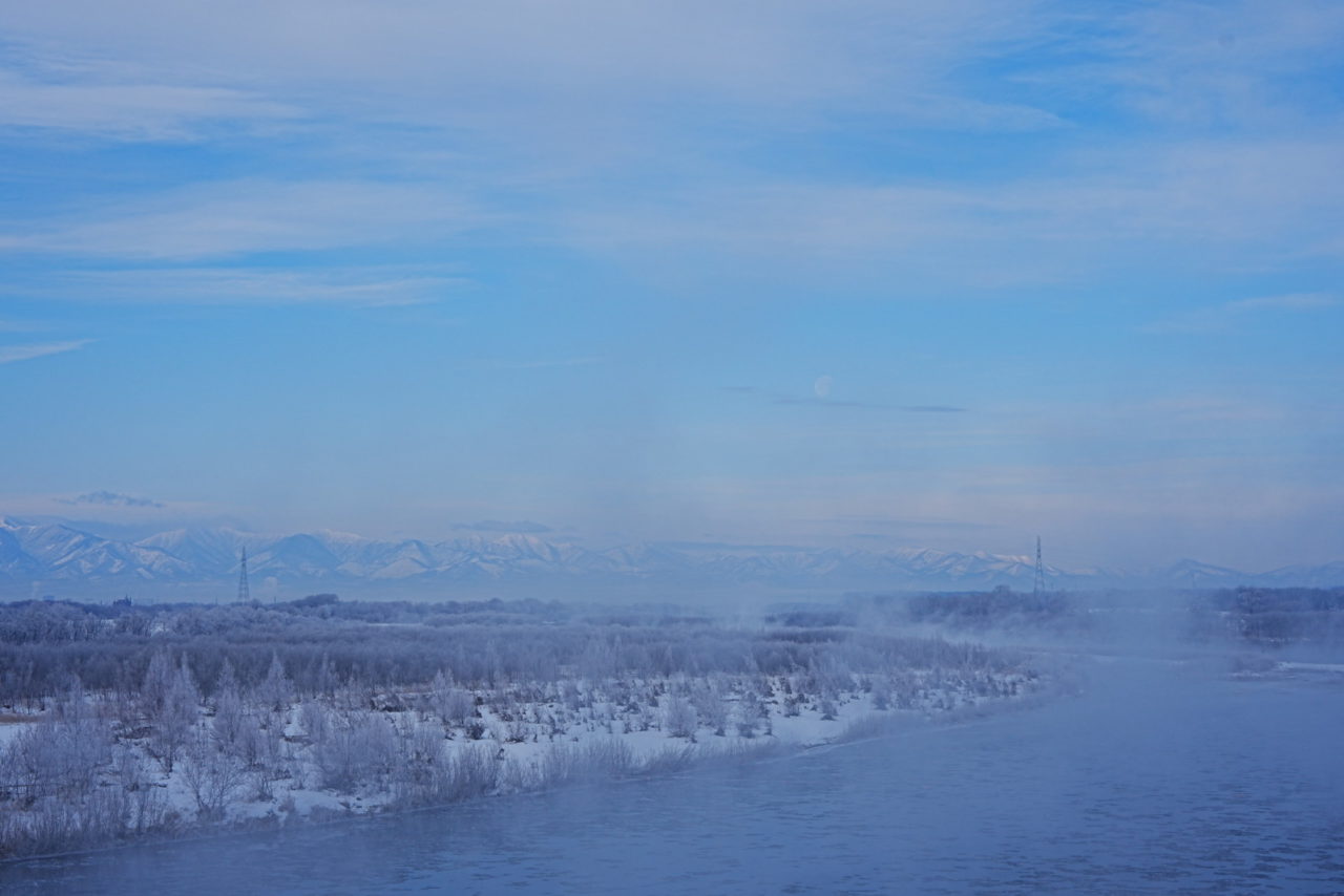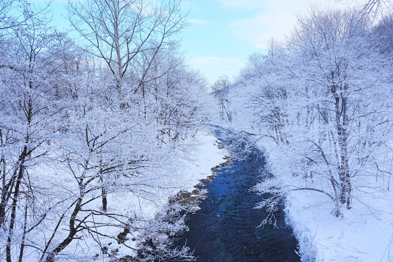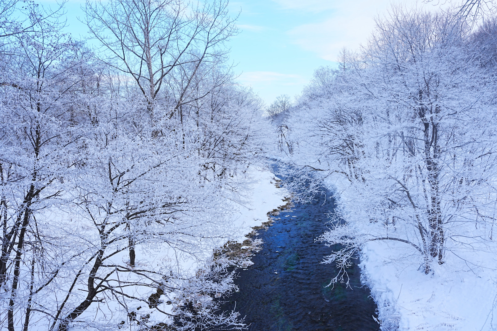 近くのこの川から水蒸気が上がって、木々の枝を白くお化粧してくれますね。